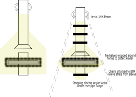 Here is my humble contribution for a possible way to cap/contain the oil leak. Kevlar 149 is very tough stuff. The info I could find says it’s good to about 27 million psi tensile modulus which I would hope would be enough to contain the oil. My idea is to have a short custom riser pipe fabricated with pads to anchor hold-down chains and a short steel cone on the bottom to align the pipe over the existing riser. A tight fit isn’t required.. because over the whole connection is a Kevlar sleeve that can be cinched under the existing pipe flange that is just under the now cutoff riser. I would also wrap the flange in a tire to protect the sleeve from the sharp edge and help seal the connection.
