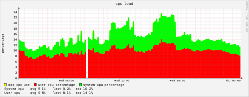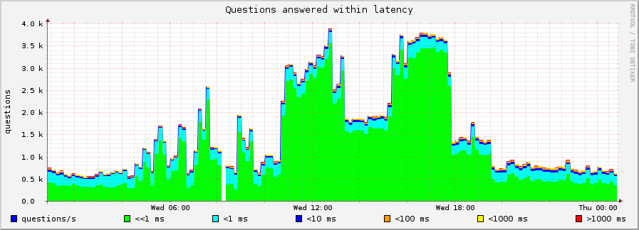 We have had a Power DNS recursing cacher deployed at one of our busiest sites for a few months now and I thought others might benefit from some real world performance info. This is running on some older hardware.. dual Xenon 2.8Ghz system with 4G of ram and the only job it’s doing is running this recursor. These three graphs tell the tale. The first shows that the system is handling peaks of about 3800 queries per second and that about 99% of those are being answered in a fraction of a millisecond. The second shows that cache hits are averaging about 70-75% and the third shows that it’s doing this work while using at most one quarter of the CPU. Add to those impressive performance levels that I’ve had zero issues since putting it in production six months ago.