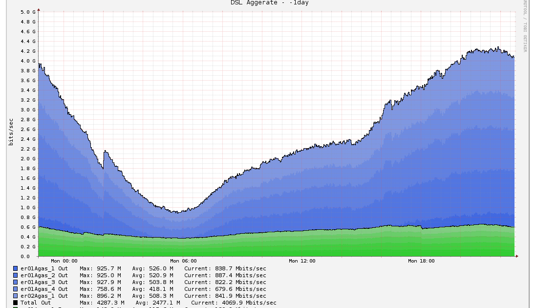 {% img left inline_datavis11.png %} This last example is the most recent. In addition to telecom the company also deals with a small but growing number of DSL customers which require us to manage and maintain the backend network that connects these users to the internet. Without getting too technical.. the backend router has several gigabit circuits from the ‘last mile’ provider that converge into a set of redundant routers in our CoLo. Over time.. these feeder circuits can become imbalanced and blocks of users must be moved to other circuits. We also need to keep track of overall circuit usage so we know when more circuits (which are quite expensive) will be needed. So.. tactically we need to know what’s happening on the circuits in a very high resolution view tracking both peaks of individual circuits and aggregate bandwidth and strategically we need to know if those peaks are trending up or down over a period of months. This info along with active customer counts and average usage-per-customer can be relayed back to sales for their trending and pricing. Since this is new I don’t have a useful peaks graph yet.. but this is an idea of the tactical data referenced for circuit balancing and circuit addition. This data is collected with snmp in 1 minute increments and stored in an RRD database that is setup to keep two sets of data for this trending. One dataset contains every 1 minute sample for a period of 7 days. As the data ages beyond 7 days it flows into the second set. It examines a 24 hour period and stores only the peak values for that day and those data points are saved for 5 years for long term trending.