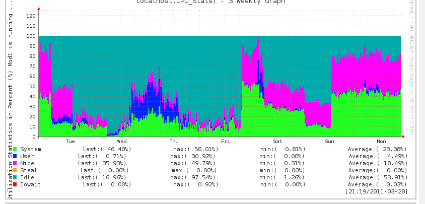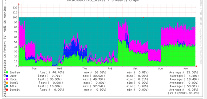One of my primary tasks in my current role is to build and run the network monitoring system. This is done with all open source software that is very powerful and very flexible. I’m constantly developing new aspects of the system to customize it to the needs of a growing VoIP carrier network. These are two examples of the sorts of server level stats we collect on nearly all the systems being monitored. The first is a long term trend plot of a system load. The second is a weekly plot of what the CPU was spending time on. This sort of information is great for forensic troubleshooting (ie root cause analysis) and for capacity planning. In addition to CPU usage we also track memory usage, process counts, service response times, bandwidth usage, database query performance, and the network BGP mesh status. Some stats are just trended some are trended with threshold alarms including some rate of change alarms that are very responsive to service problems.