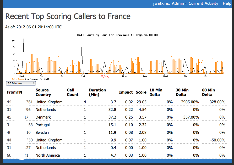 This shows a progression of the interface during a normal day when nothing unusual was going on. It’s not obvious.. but many elements in the data are clickable to pull up different views centered around certain elements like a specific caller or specific country.. or activity between a specific pair of countries. The time scale can also be adjusted from the default of 30 minutes out to all data we have in the database which currently goes back 45 days.